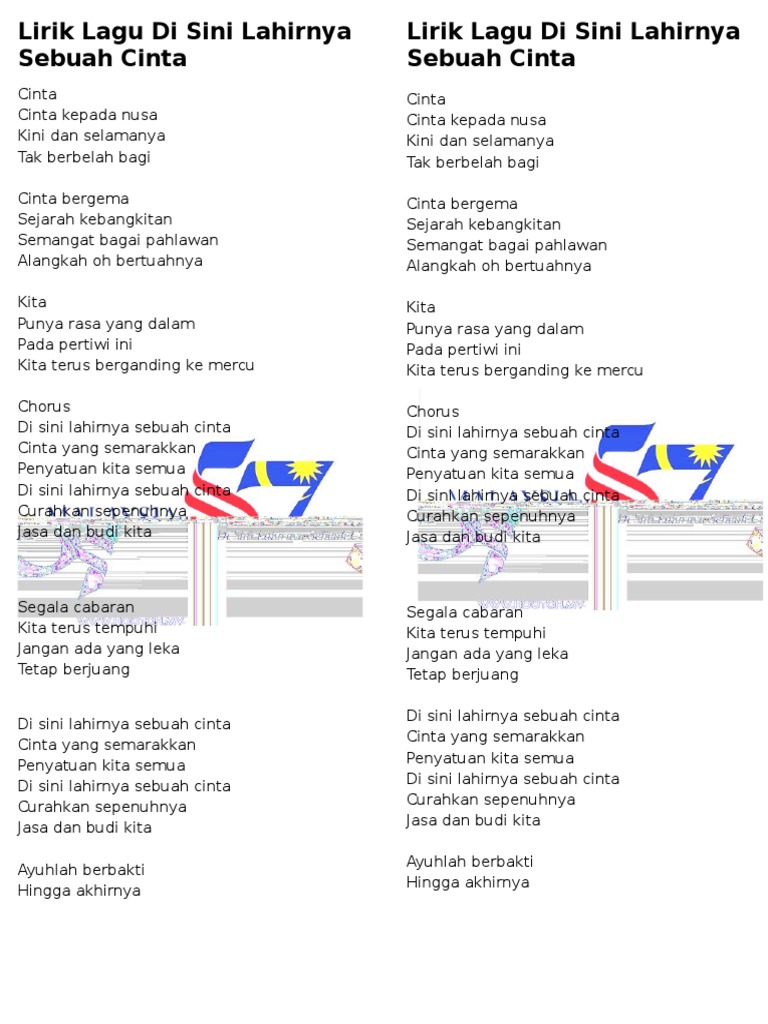 lirik lagu disini lahirnya sebuah cinta. Di sini lahirnya sebuah cinta penyanyi: Lirik lagu setia lagu patriotik. Bob yusof cinta cinta kepada nusa kini dan selamanya tak berbelah bagi cinta bergema. Disini lahirnya sebuah cinta yang murni abadi sejati disini tersemai cita cita bercambah menjadi warisan korus andai ku. Am g di sini cinta pernah membara f e tanpa bahang dan tanpa apinya. Sudirman, lyrics :disini lahirnya sebuah cinta yang murni abadi sejati disini tersemai cita cita bercambah menjadi warisan ( korus ).